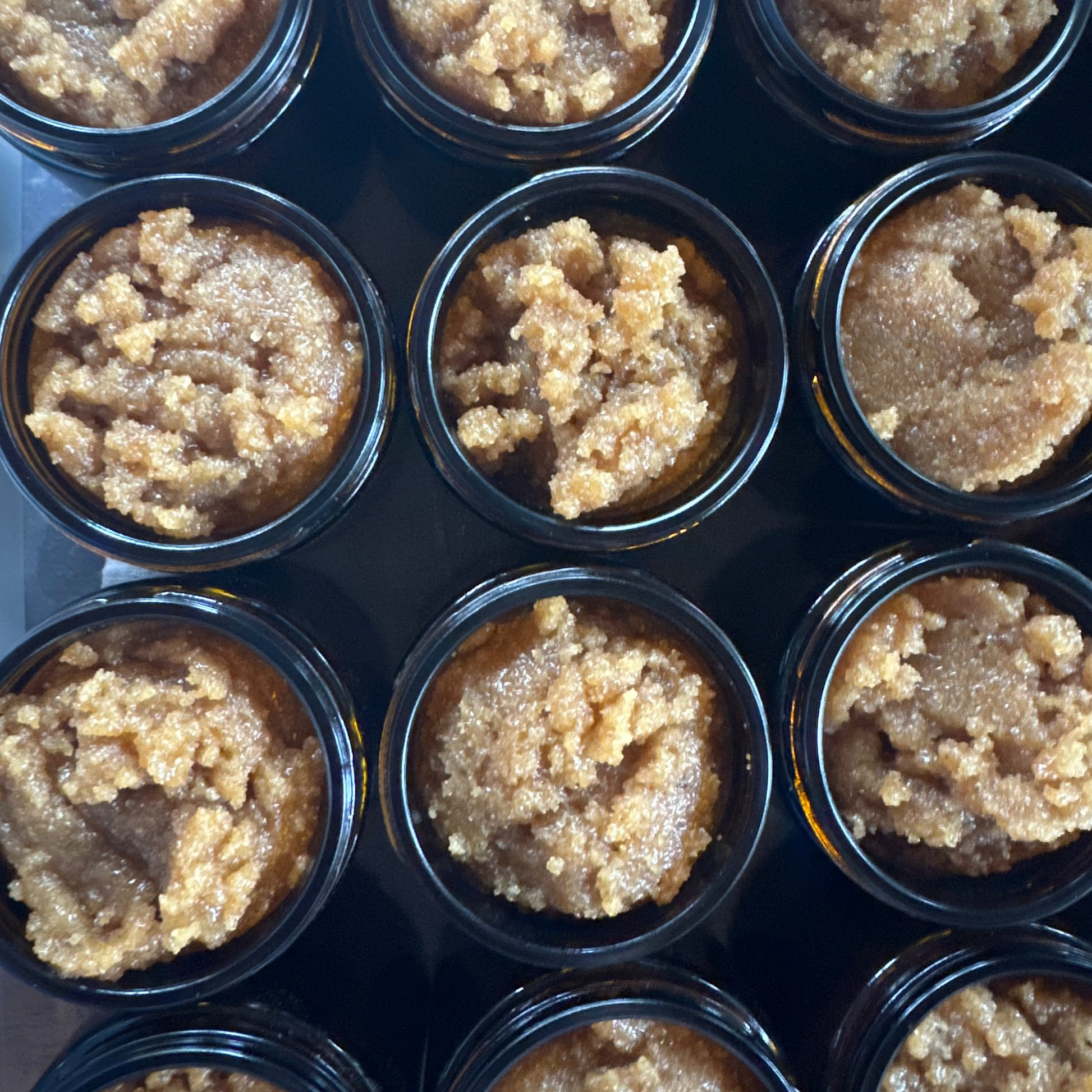 Organic Cane Sugar, Redmond Sea Salt, Jojoba Oil, Shea Butter, Mango Butter, Raw Honey, Arrowroot Powder, Colloidal Oatmeal, Vanilla Oleoresin, Benzoin Resin, Peppermint Essential Oil.